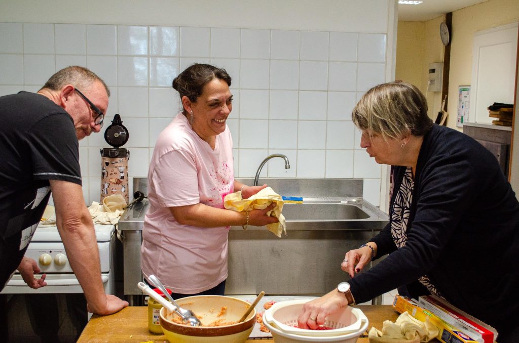 À la salle des fêtes de Nannay, les bénévoles du centre social La Pépinière s’activent en cuisine pour préparer un repas solidaire à l’occasion d’Octobre Rose. Au menu : entrée à la betterave, saumon et cookie aux pralines, le tout fait maison.